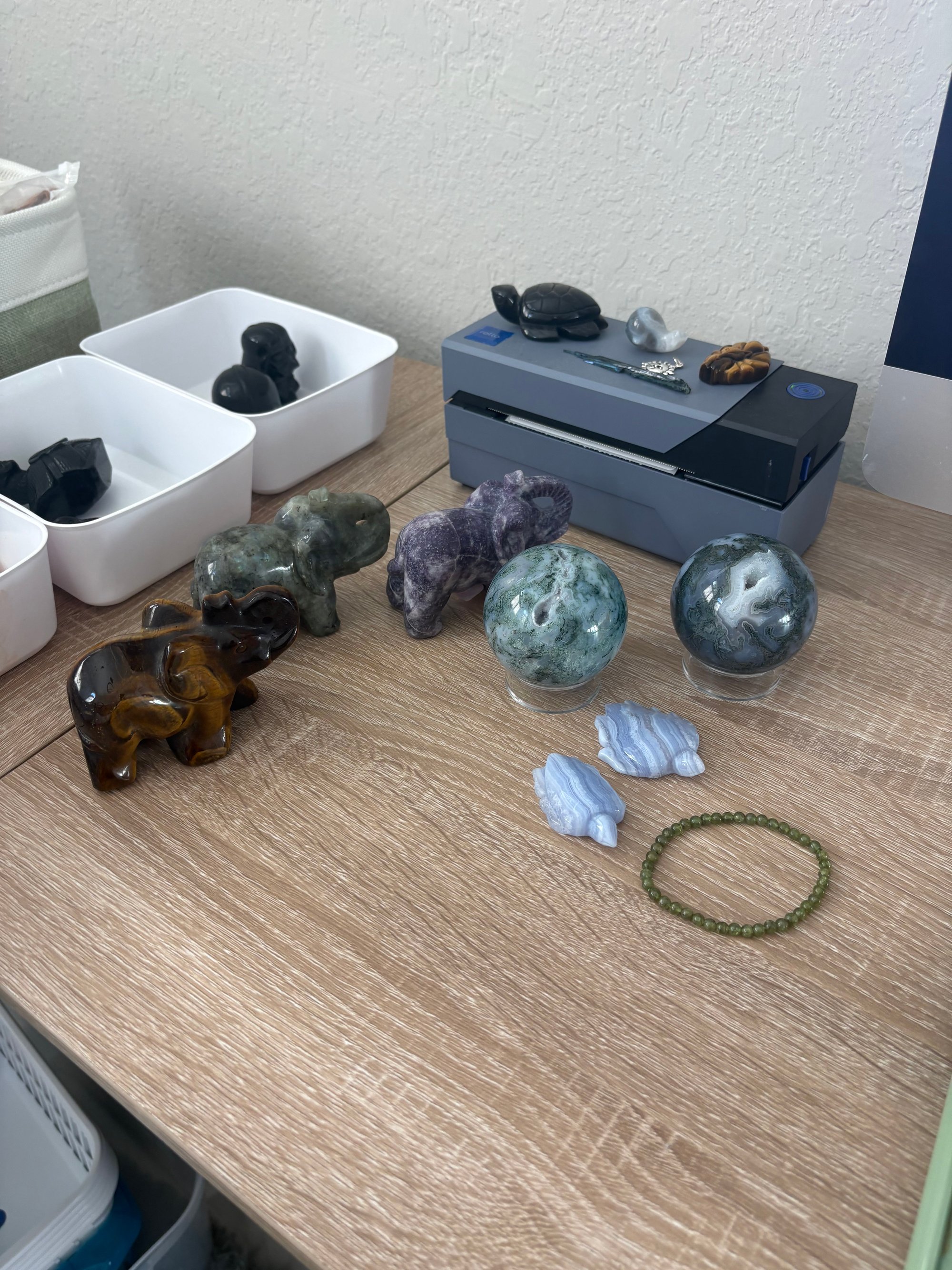 - moss agate sphere $15 - moss agate sphere $13 - 2 blue lace agate turtles $24 - labradorite, tigereye & lepidolite elephants $45 - prehnite bracelet $4