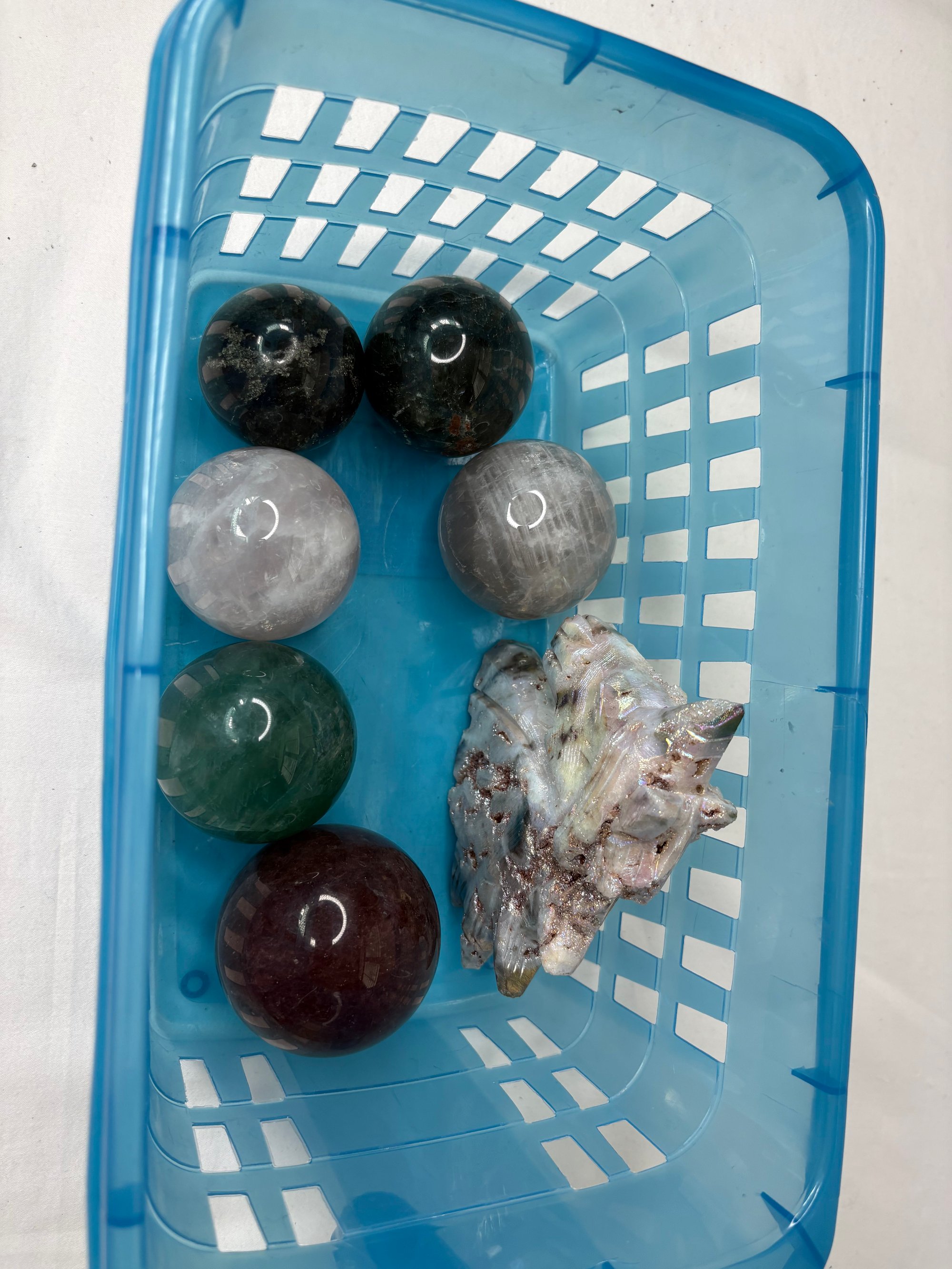 - 2 lavender rose quartz spheres #25 - 2 emerald spheres $25 - green fluorite sphere $15 - aura sphalerite unicorn $18 - strawberry quartz sphere $17