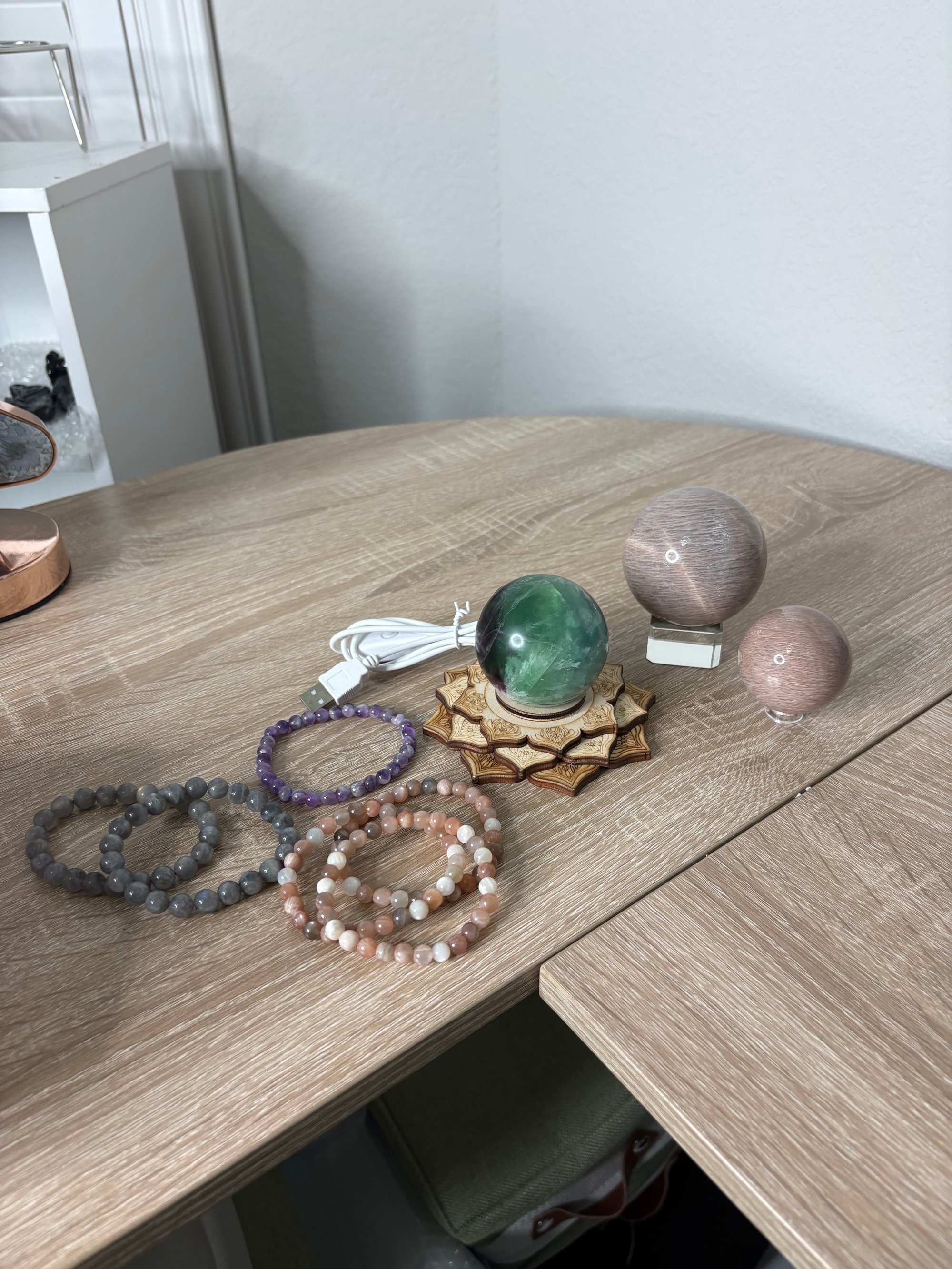 - Moonstone Sphere $20 - Moonstone Sphere $5 - Fluorite Sphere $17 - Light Stand $5 - 6 Bracelets $12