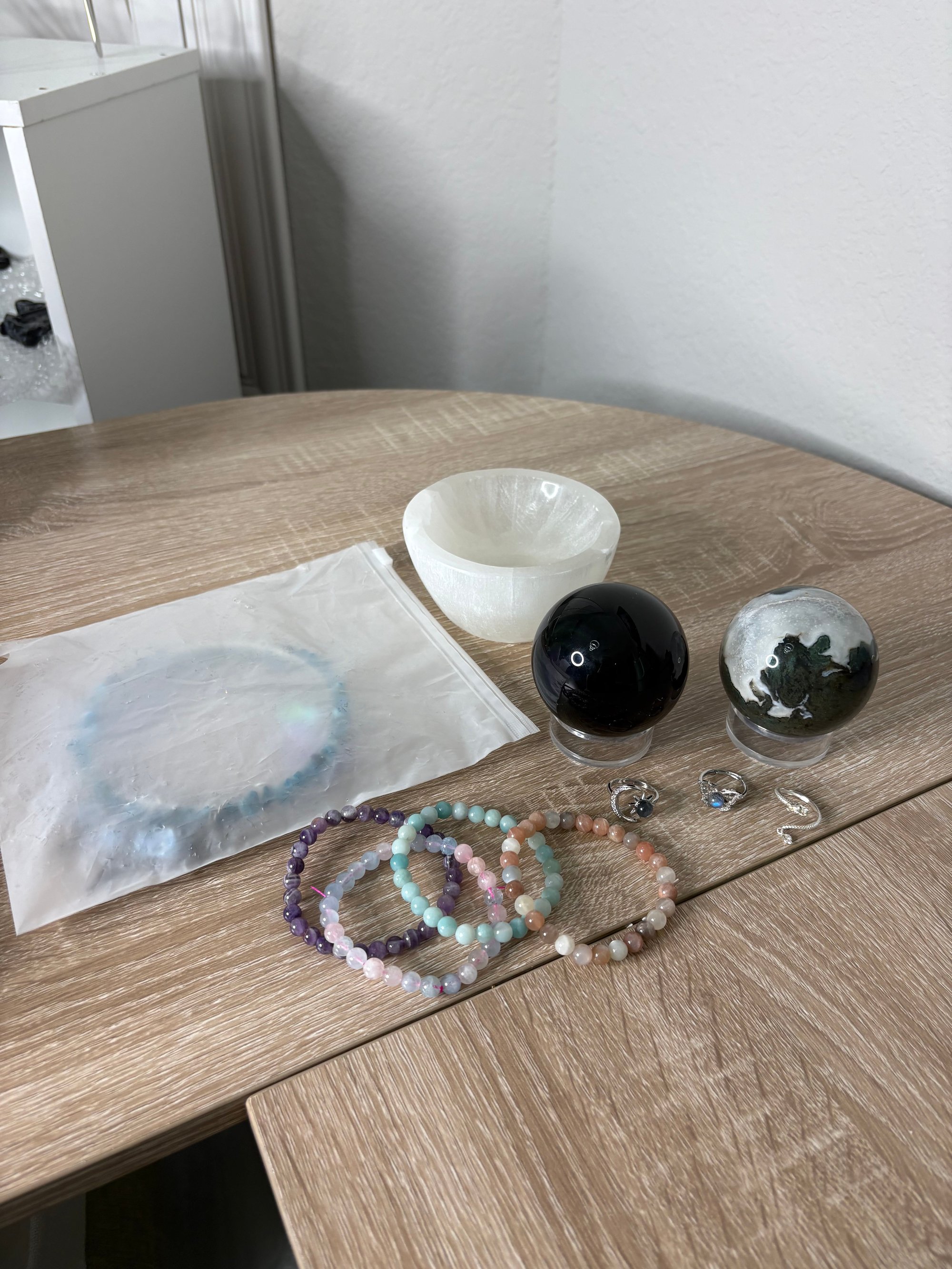 - Apatite Suncatcher $8 - Moss Agate Sphere $10 - Rainbow Obsidian Sphere $8 - Selenite Bowl $17 - 3 Rings $19 - 4 Bracelets $8