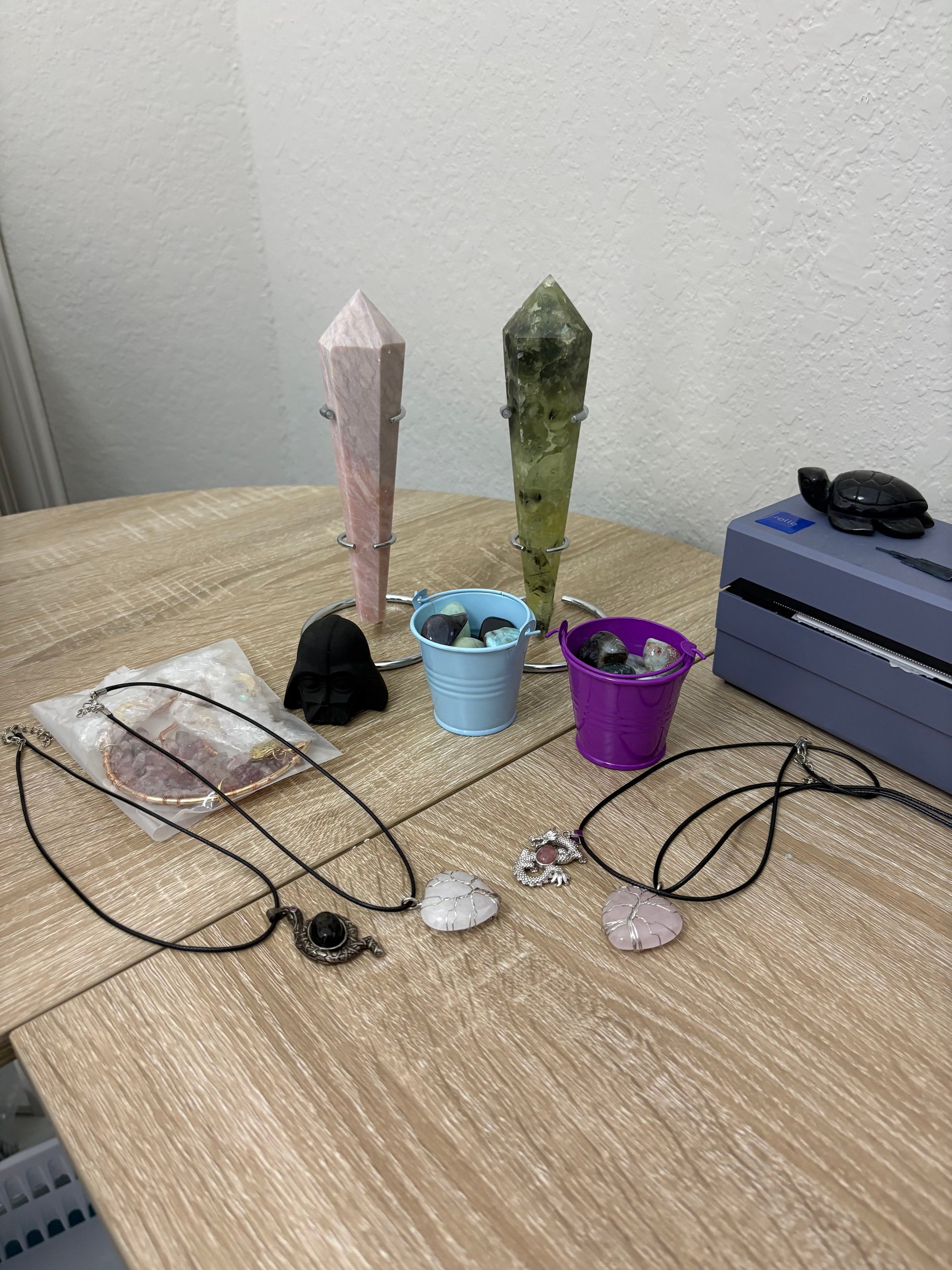 - Prehnite Wand $18 - Pink Opal Wand $15 - Strawberry Quartz Suncatcher $12 - Obsidian Darth Vader $6 - 2 Tumbles Buckets $14 - Heart Necklaces $8 - Dragon & Snake Necklaces $14