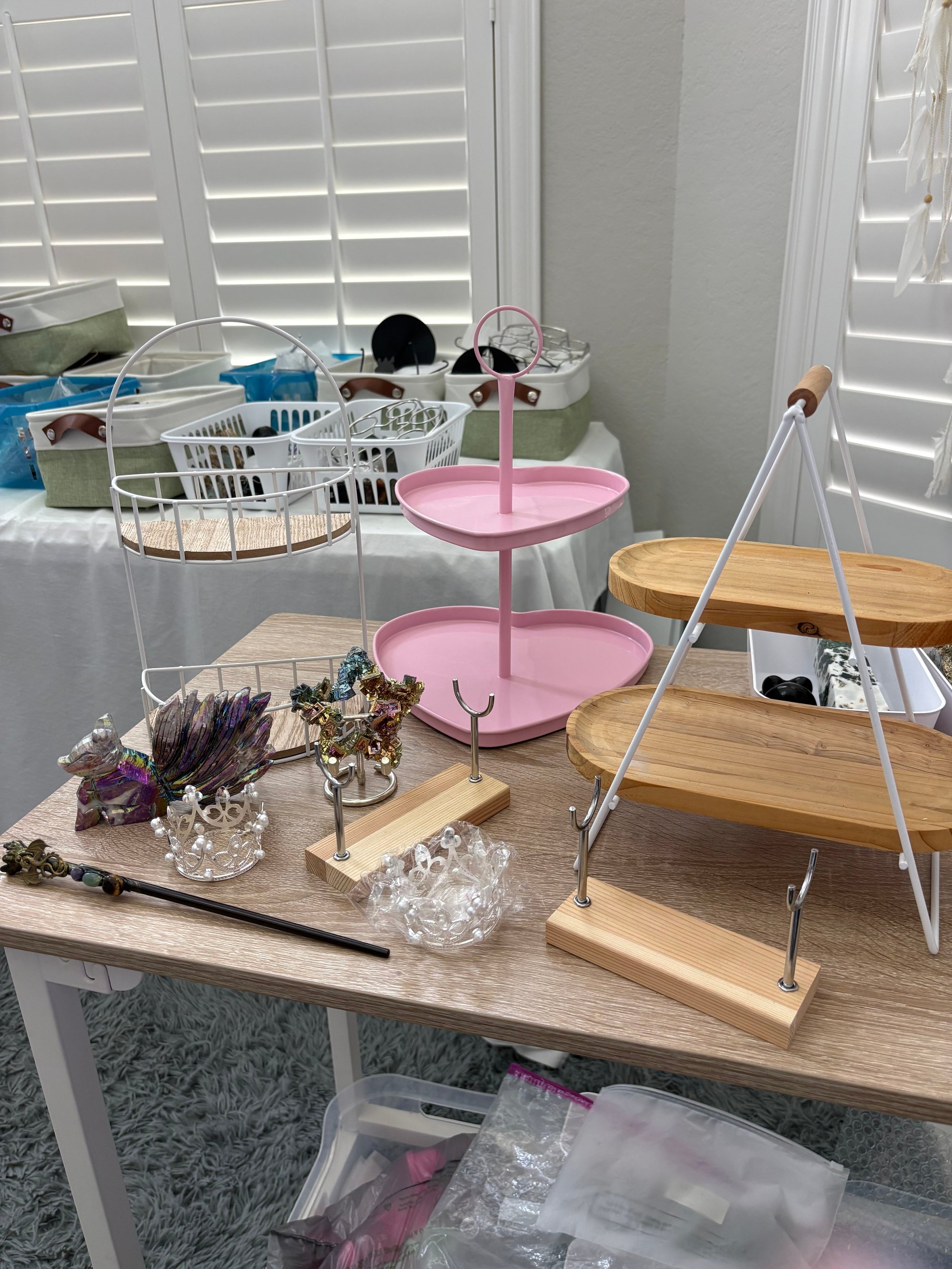- heart stand $9.50 - woodsen stand $9.50 - wooden stand $6.50 - aura sphalerite fox $18 - wand $9 - bismuth star $14 - 2 crown stands $10 - wand stand $4 - multi mini sphere set $13