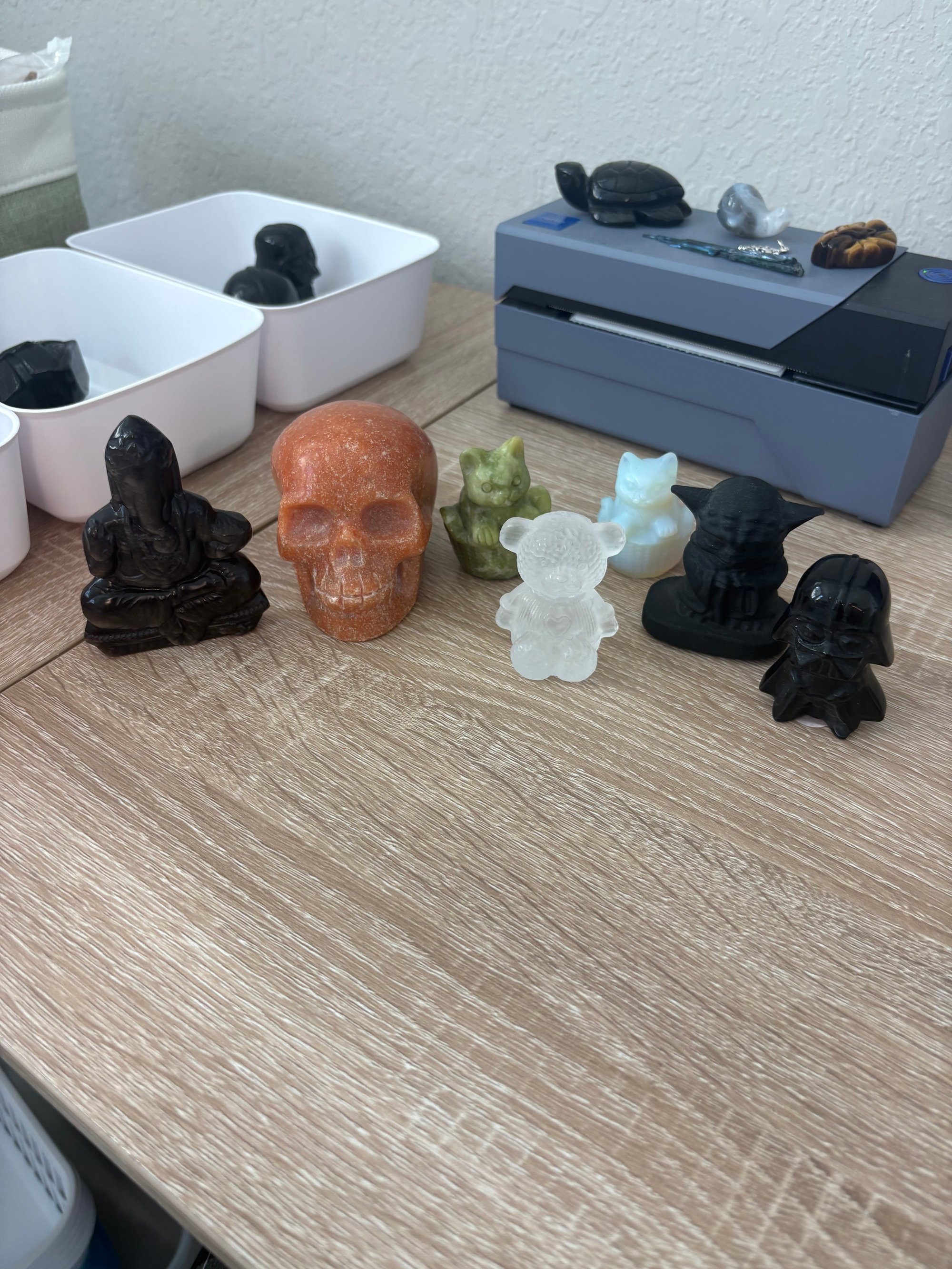 - obsidian yoda $5 - obsidian darth vader $10 - clear quartz teddy bear $10 - opalite and green jade basket cats $16 - sunstone skull $22 - sheen ganesha $12