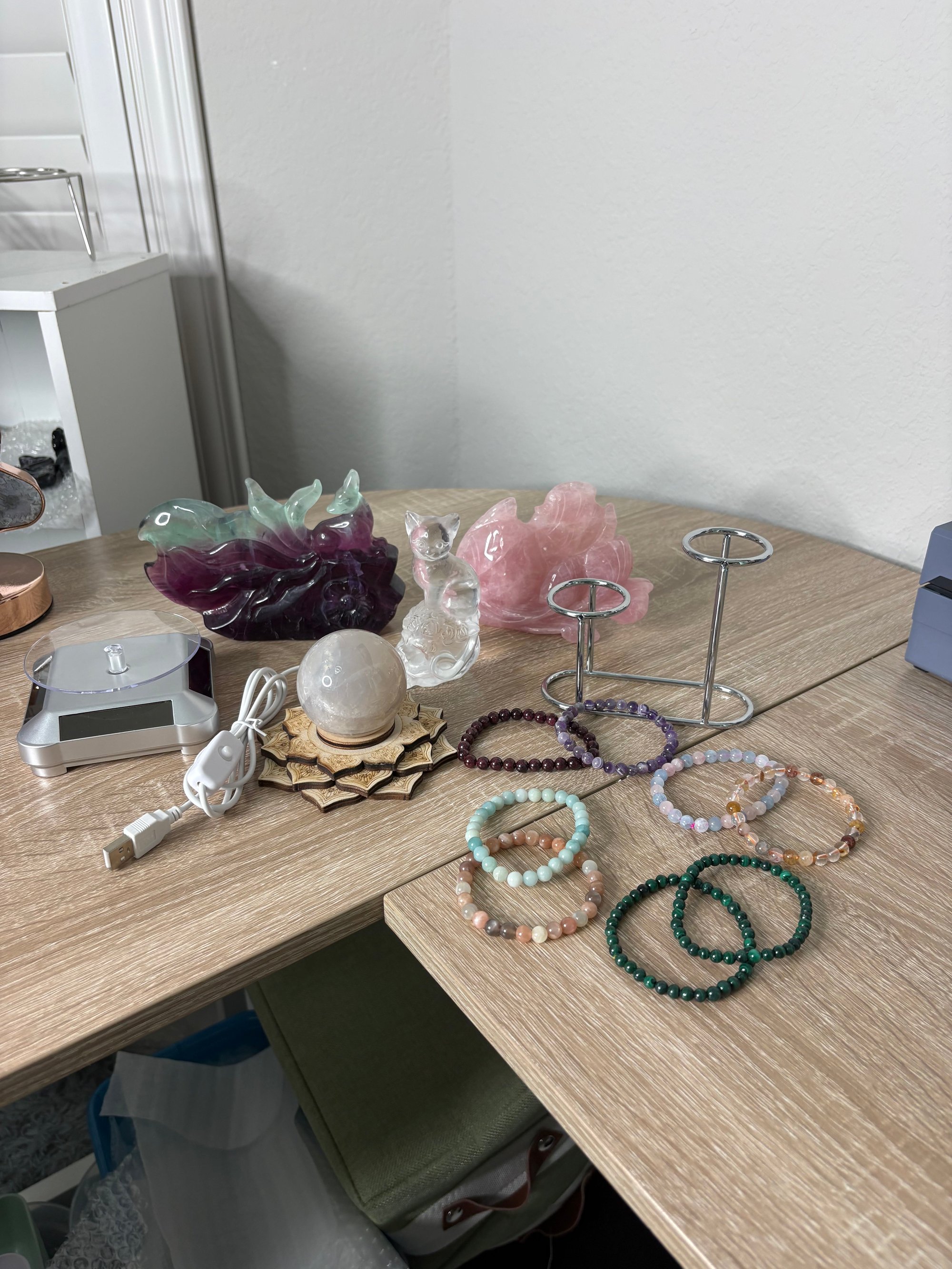 - Fluorite 9 Tailed Fox $55 - Rose Quartz Fish $20 - Smelting Glass Cat Skull $17 - Blue Rose Quartz Sphere $10 - Lotus Light Stand $5 - Solar Panel Stand $5 - Silver Stand $4 - 8 Bracelets $16