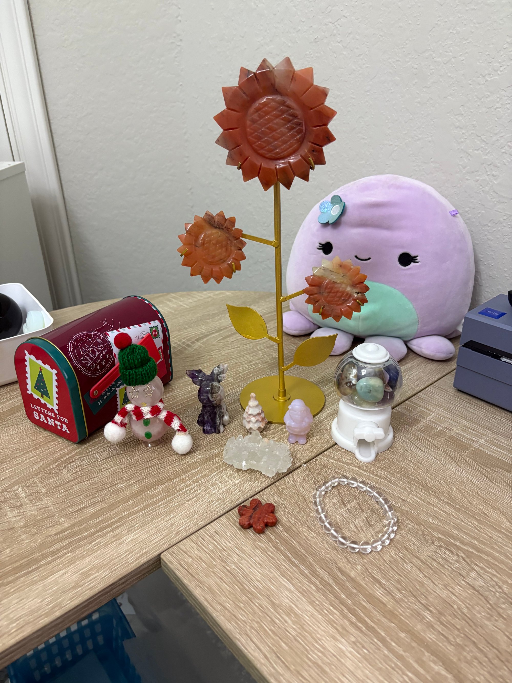 - Carnelian Flower $35 - Christmas Bundle $15 - Crystal Candy Machine $5 ~ Clear Quartz Bracelet ~ Clear Quartz Cluster ~ Amethyst Reindeer ~ Red Jasper Snowflake ~ Red Vein Tree ~ Opalite Santa